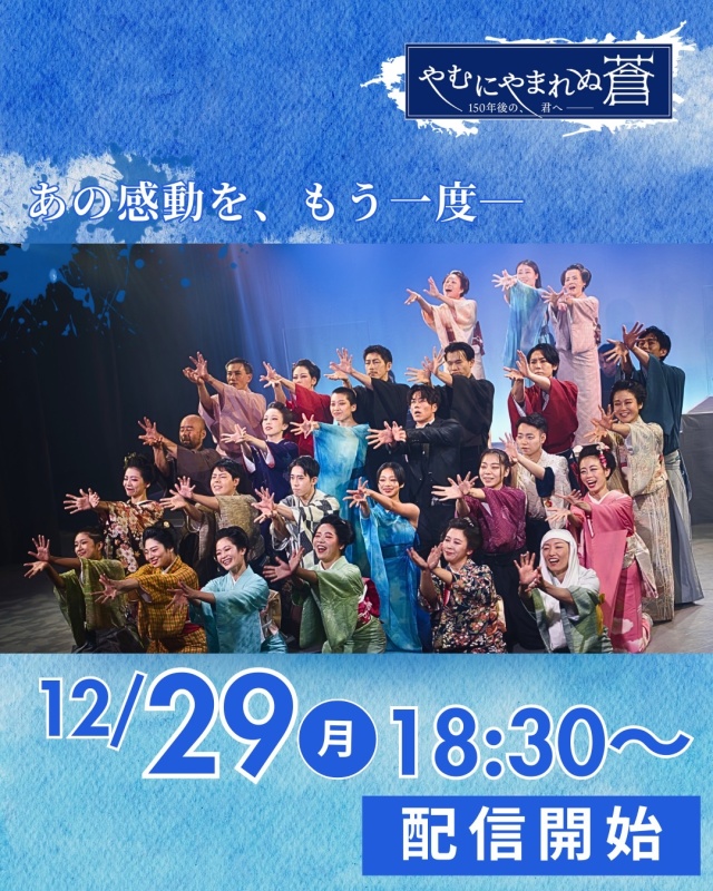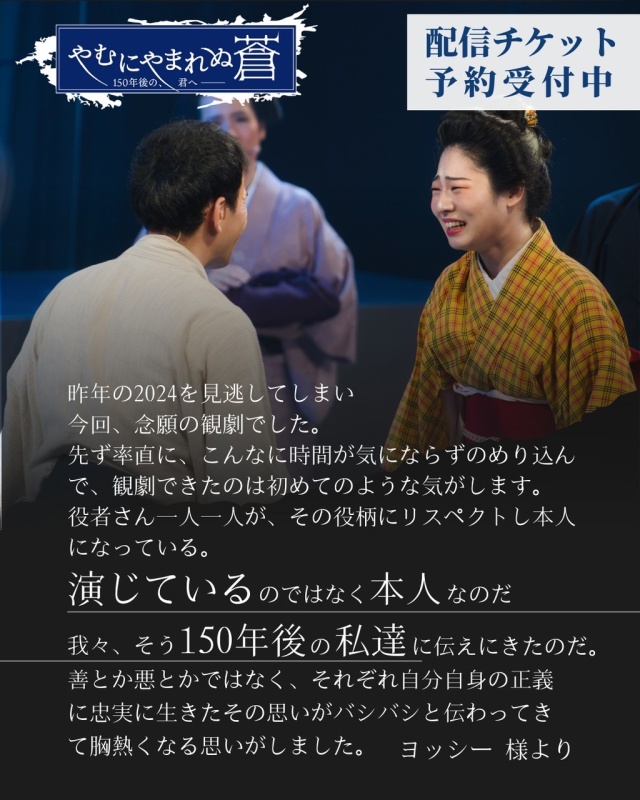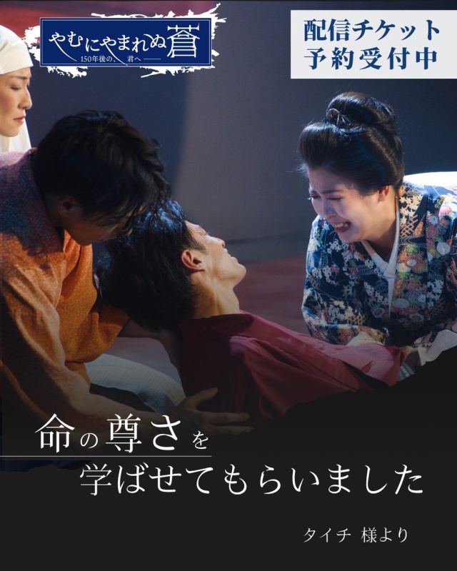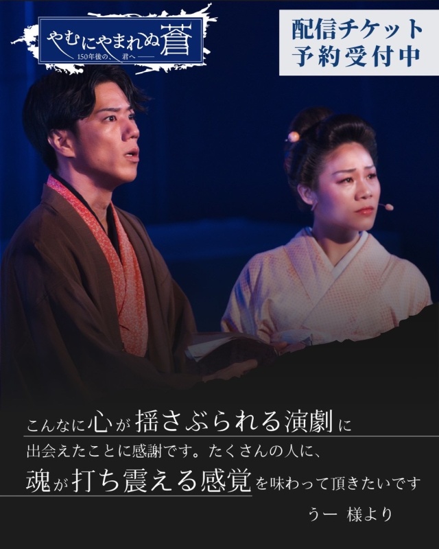 11/13(木)~11/17(月)にシアターアルファ東京で上演された『やむにやまれぬ蒼~150年後の、君へ~』の配信チケット販売ページです。